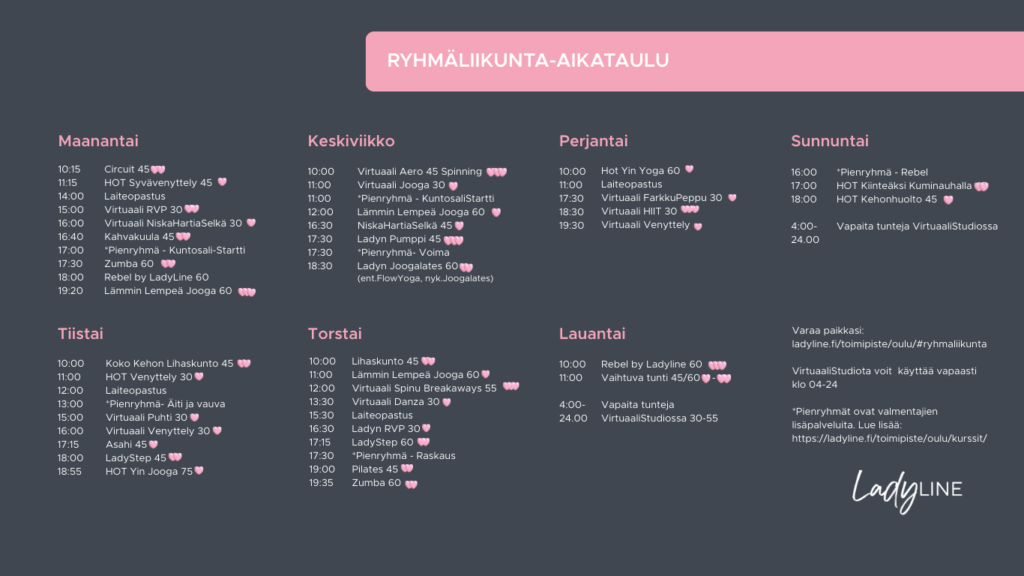 LadyLine Oulun monipuolisesta ryhmäliikuntakalenterista löydät mm. seuraavia tunteja. Tervetuloa!